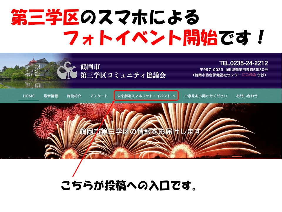 第三学区の素敵なところ、好きな場所、美しい景色など学区の皆さんと一緒に楽しめればと思います。(第三学区を離れた方にも今の三学区を見てほしい。)