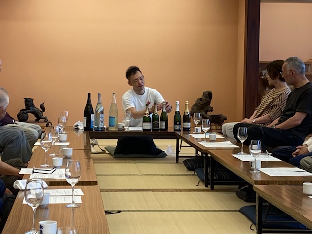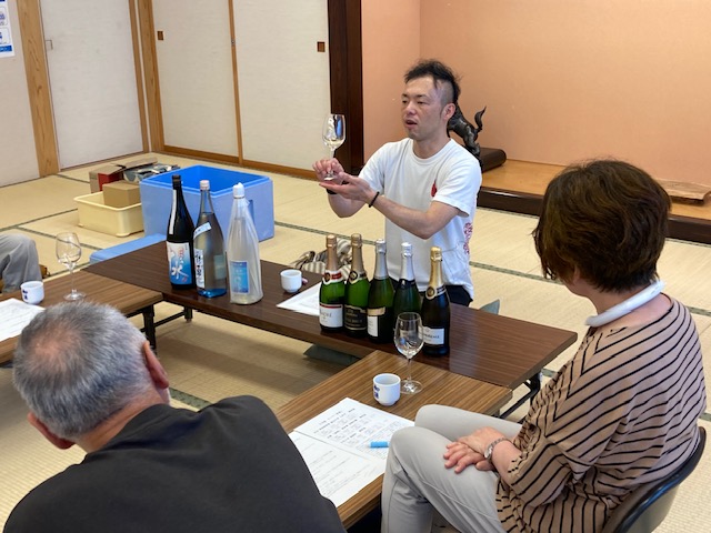 講師のソムリエ・庄内ざっこ店長の齋藤亮一氏からは、ワインと日本酒の基本的な味わい方や見分け方などについてお話をしていただきました。そのあと、お持ちいただいた爽やかな飲み口のスパークリングワイン5種類と夏にあう日本酒「夏酒」として、「大山 特別純米酒 夏の十水」「杉勇 「夏純」純米酒出羽の里」「フモトヰ 夏純吟」についてそれぞれのワインや日本酒の特徴などについてもお話しいただきました。
